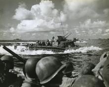 Landing Vehicle, Tracked (Armored) moving through water carrying troops. "File no: C.G. 2914. Going in at Anguar - Guns...