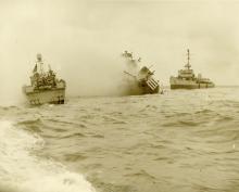The USS Threat (AM-124), a rescue vessel, nearing the sinking USS Tide (AM-125) that was hit by German mines the on D-...