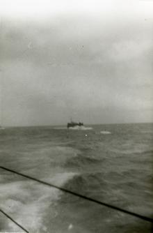 Photograph. Unidentified naval vessel at sea as seen from the deck of the LST-659. Another vessel is visible in the far...