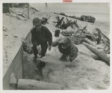 Members of a U.S. Navy beach battalion dive for protection on Normandy shore in June 1944. "File Number 252841. June 20...