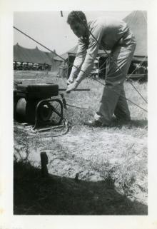 Photograph. Corporal Reed winds up an X-Ray generator. Personal caption on photo reverse: "A P Hill, Corp Reed, xRay...