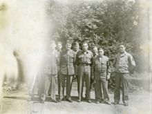 Photograph. Corporal H. M. Neal, Jr. stands outside in front of a tall hedge with eight fellow soldiers. Personal...