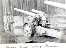 American soldier standing next to German howitzer, the 15 cm schwere Feldhaubitze 18 or sFH 18. "German guns, Konig,...