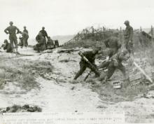 Soldiers advancing through a destroyed French town. "ETI-HQ-44-5456. Riley. 16 June. Signal corps photo. American...