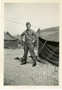 1st Sgt. Wallace posing in front of a tent, Calas Staging Area, Germany, 1945