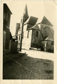 Photograph. A church and an empty street of Nanteuil, France. Personal caption on photo reverse: "Nanteuil-le-Haudouin...