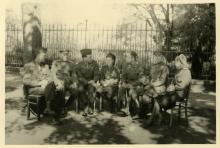 Americans meeting the Russians in Berlin in April 1945. MacFarland and other 5th Armored Division soldiers seated with...