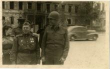 Americans meeting the Russians in Berlin in April 1945. "Philipsborn, Margarita Preskova, General Anaskin." 5th Armored...