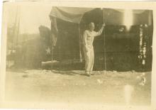 Photograph. William Denmire standing in floodwater ; Army tents are in the background. Personal caption on reverse: "...