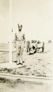 Hamilton Neal in military uniform stands near flagpole, Camp Kohler, California, August 1943