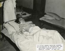 "Filipinos help wounded soldier near San Nicolas, Luzon." 3 March 1945