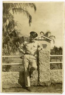 American soldier leaning on fence, possibly Hawaii c. 1943. Building and palm trees in background. "You probly have...