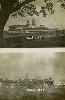 Mass produced photograph with two images featuring the Walled City/Intramuros in Manila, Philippine Islands, both pre...