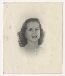 Unidentified Red Cross woman probably outside the Red Cross club 'Riverside Inn' on Tinian. "Kay Brennan. Tinian 1945."