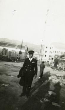 An African American chief petty officer poses in a village in Japan in the 1940s.
