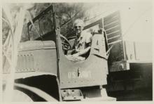 Unidentified U.S. soldier standing with American Red Cross vehicle/bus; probably on Tinian in late 1945 or early 1946