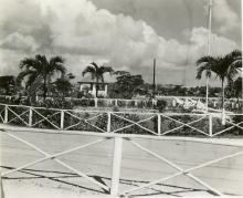 US airmen outside of a Pacific island quartermaster storehouse; men separated from goods by a chain-link fence. '"...