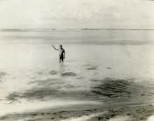 US serviceman Spinks crouching on a coral reef on Sterling Island in 1944