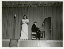 Civilian man playing piano and woman singing onstage at the Abeline, Texas, Air Force Base in 1944