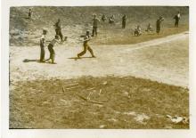 Photograph. A serviceman stepping onto a base while the baseman is crotched to catch the ball. Location unknown. No date