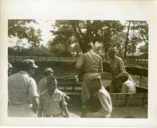 Negative. Group of Allied servicemen gathering supplies piled outside of a Douglas C-47 Skytrain; a female...
