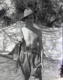 Negative. Australian Army serviceman posing shirtless with his firearm; a tent is in the background. Bahe, Burma [...
