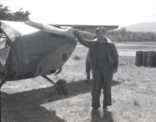 Photograph. Corporal Clinton Dobson [left] and another United States serviceman posing in front of a Piper L-4...