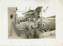 Photograph. Boatswain's Mate Richard leaning against a stair rail aboard a landing craft. Location unknown. No date