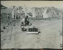 US servicemen drawing into sand to make topographic map for training exercises. "2-25-44. Barry. 2nd Lt. Robert...