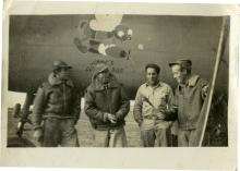 Photograph. Four uniformed U.S. airmen stand together outside. Photograph has autograph of each man. England. 1944-45