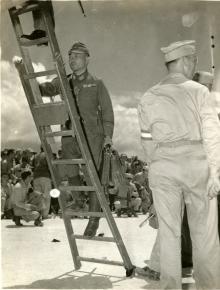 Photograph. Japanese officer waiting to climb up a ladder to board a Douglas C-54 Skymaster; a large crowd of airmen...