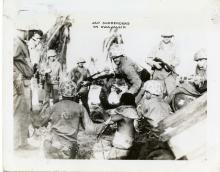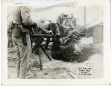 A surrendering Japanese soldier, surrounded by Marines, is pulled up out of a foxhole. There is a machine gun on a...