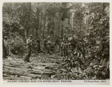 Photograph. United States Army soldiers building a log road in a jungle. Official caption on front: "Building corduroy...